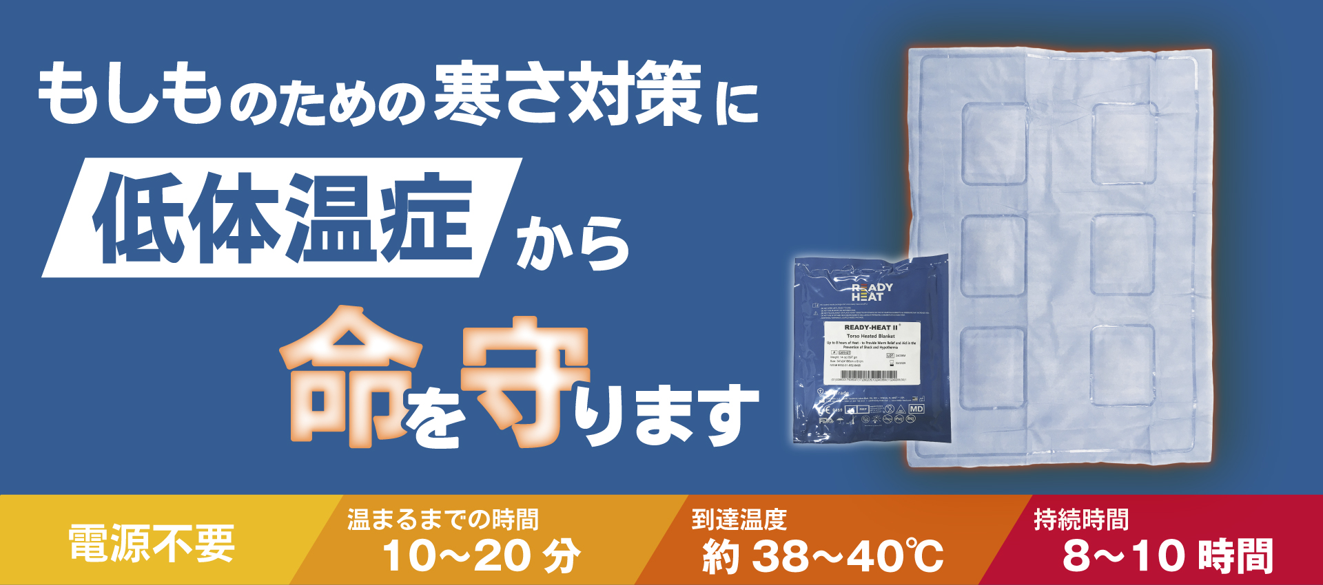低体温症の予防措置のためにアメリカで開発された使い捨て加温ブランケットです。独自にデザイン・製造されたオリジナル製品で、米軍・EMS・山岳救助隊・水上救助隊・世界の病院などで使用されています。アルミシートのような保温ではなく物理的に加熱する自己発熱式のため確実な体温維持に効果的です。