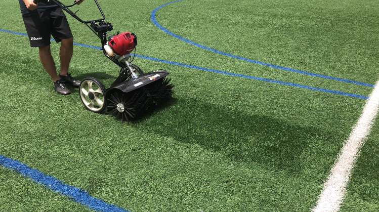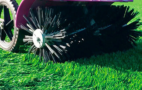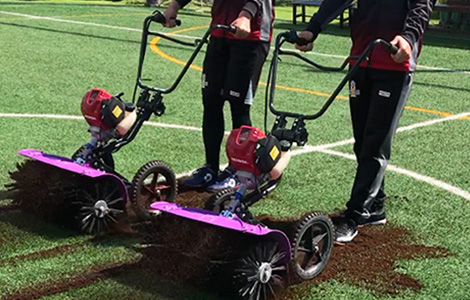 寝ぐせがついてしまった芝を回転式ブラシで立たせることでクッション性を取り戻します。