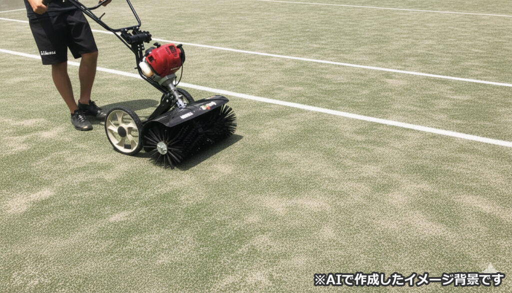 砂が偏ると、プレイヤーのスライドや踏ん張りによってより一層芝が摩耗しやすくなり、コートの劣化が早まります。さらに、プレイヤーの足腰への負担や、ボールのバウンドにも影響があります。ターフキーパーによる定期的なメンテナンスは、快適なプレー環境を維持するために不可欠です。